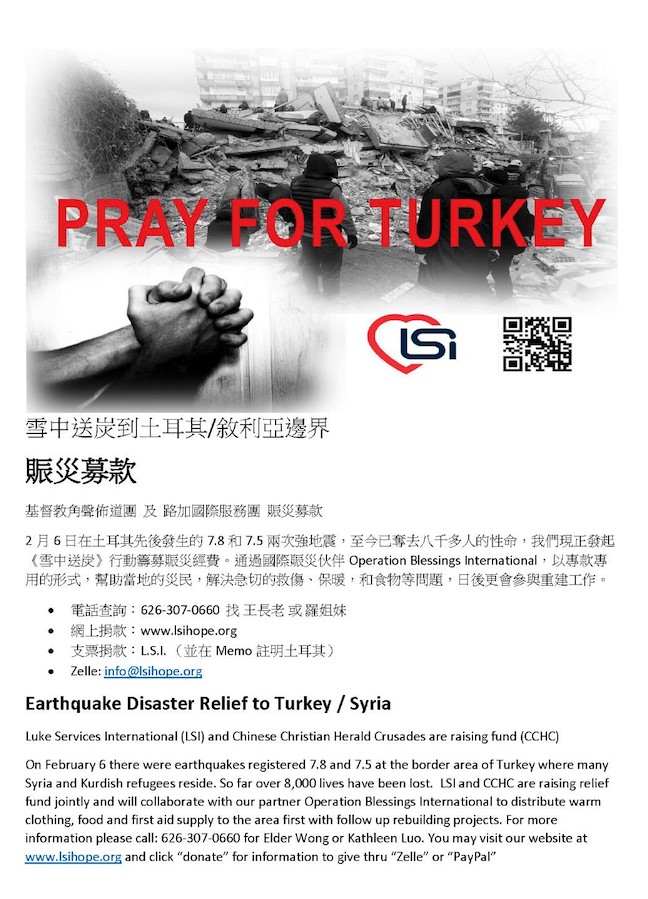 - Luke Services International (see flyer below; note your donation for Turkey in the memo section of your check, or the Message field when donating online)