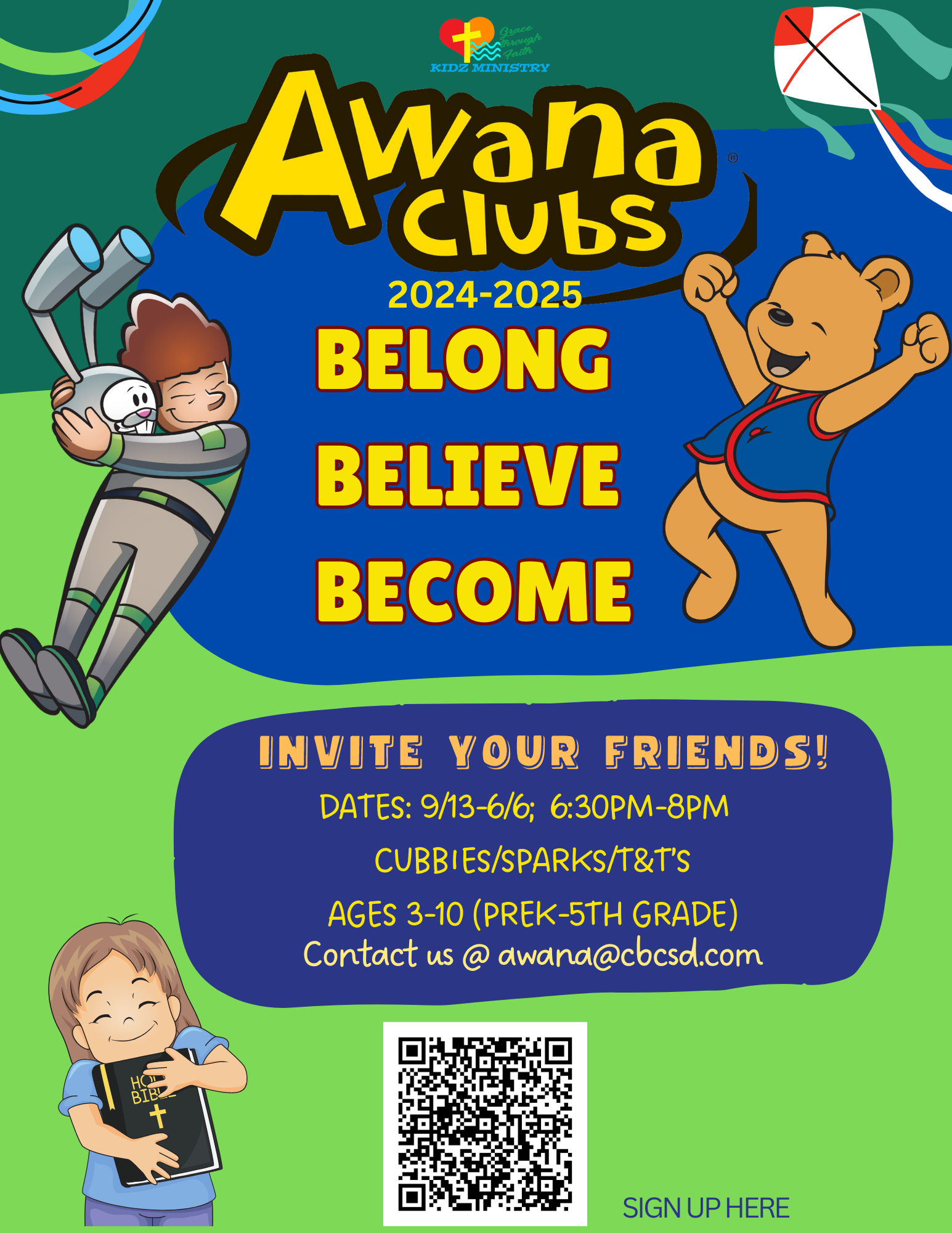 AWANA 2024-2025 will run from Friday, Sep. 13, to Friday, Jun. 6, 2025. Please note the time change, as we will start at 6:30pm and end at 8:00pm. Cubbies dismissal will be 7:45pm. Please sign up using either the link or the QR code below. We hope you’ll join us, and invite your friends too!