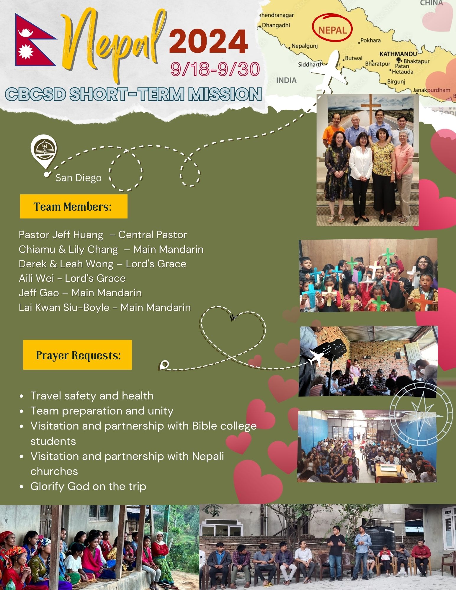 The 2024 Nepal short-term mission team is scheduled to leave on the evening of Sep. 18. They will arrive on the evening of Sep. 20 and return on Sep. 30. Their main objective is to assist the local church to plant churches in Nepal. They will do community outreach, children’s ministry, leadership conference, visitation, and prayer walks. They aim to get to know the needs of people and local churches.