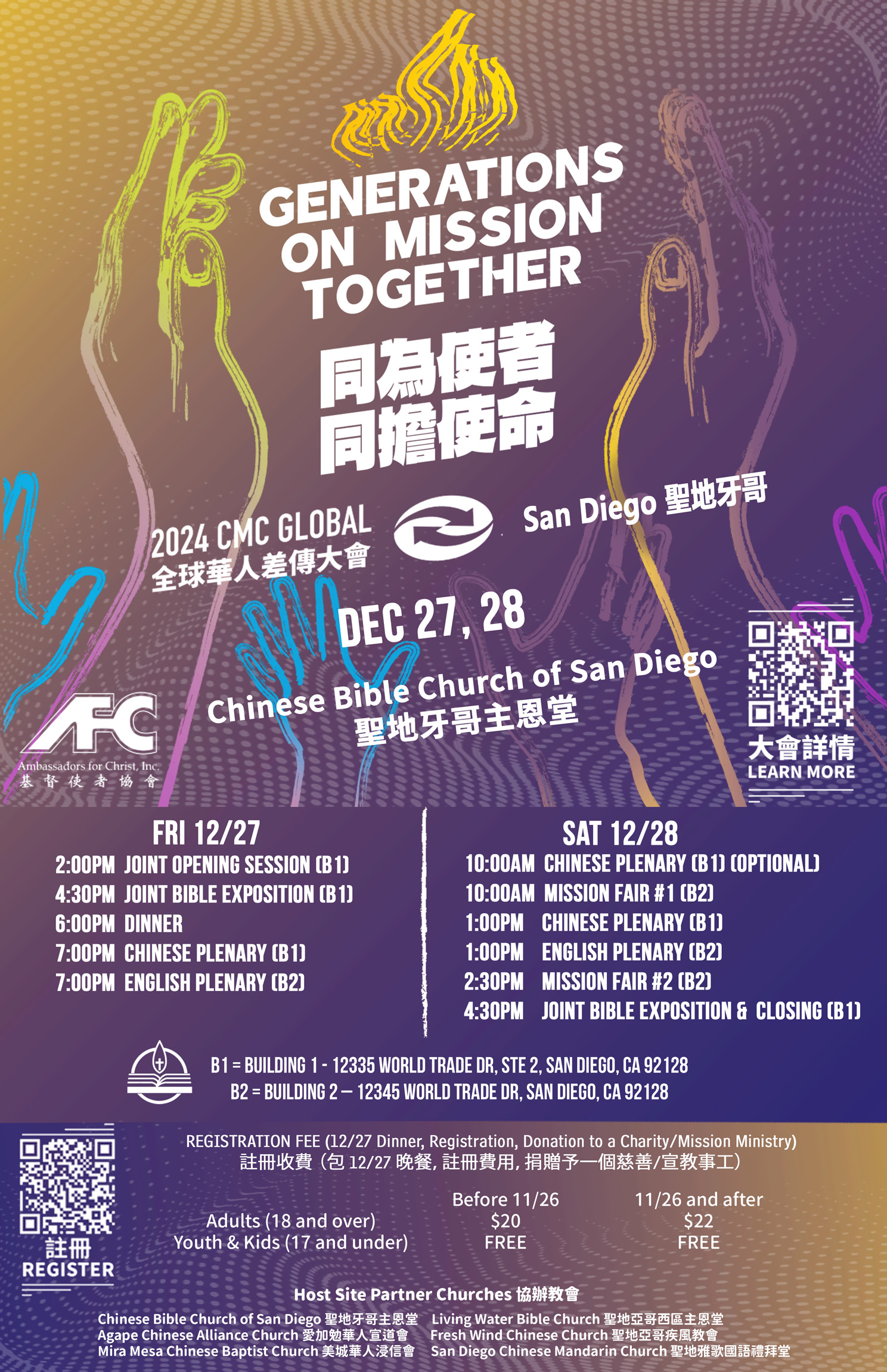 We encourage CBCSD participants attending CMC to please park in the Building 2 parking lot, and save space for people from other churches to park at Building 1. Doors will be opened for check-in one hour before the beginning of each day’s events, but the B2 parking lot will be open earlier at 12:45pm on Friday, Dec. 27, and 8:45am on Saturday, Dec. 28.