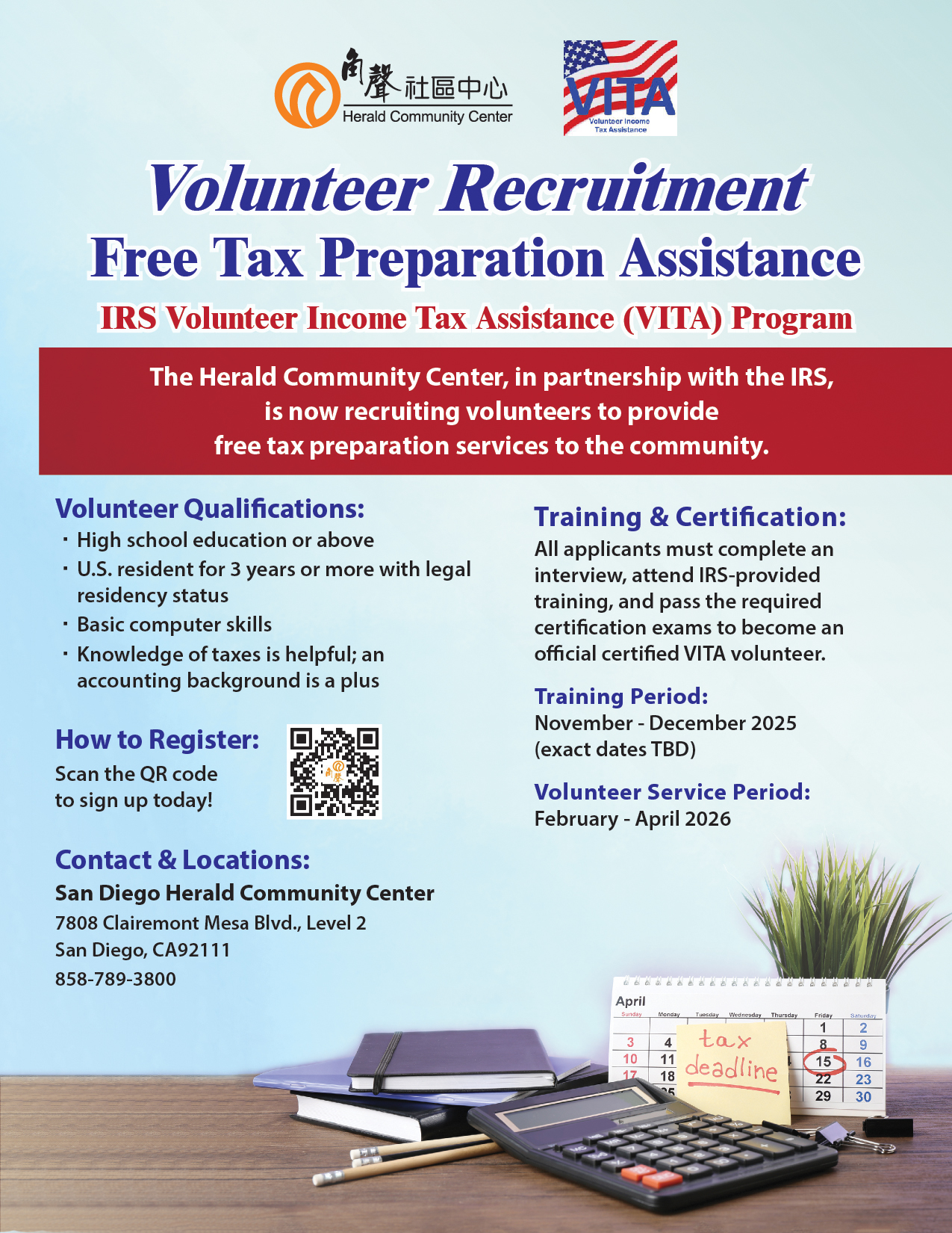 lg_web_admin October 19, 2025October 19, 2025 Featured, General AnnouncementsThe Herald Community Center, in partnership with the IRS, is now recruiting volunteers to provide free tax preparation service to the community. Please see the flyer below for details. San Diego VITA Volunteer Recruitment flyerIRS VITA Program